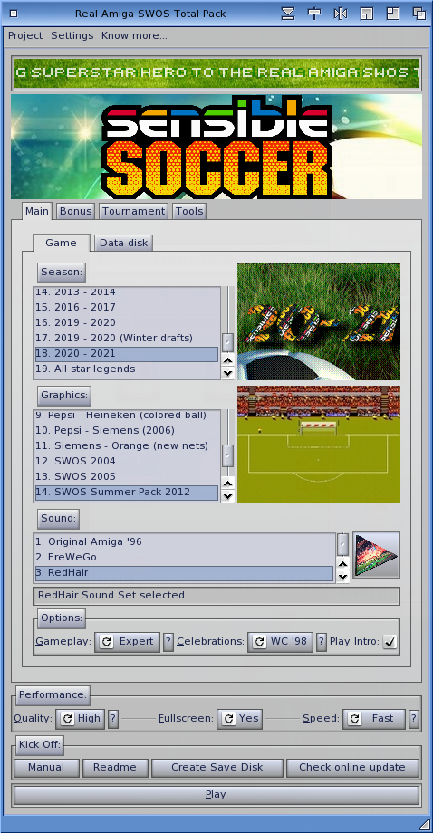 Sensible World of Soccer (SWOS) GUI launcher for on-demand compilations, featuring additional games to complete the series, a live tournament draw option for real world competitions, interactive tactic viewer, integrated RNC ProPack, and much more!